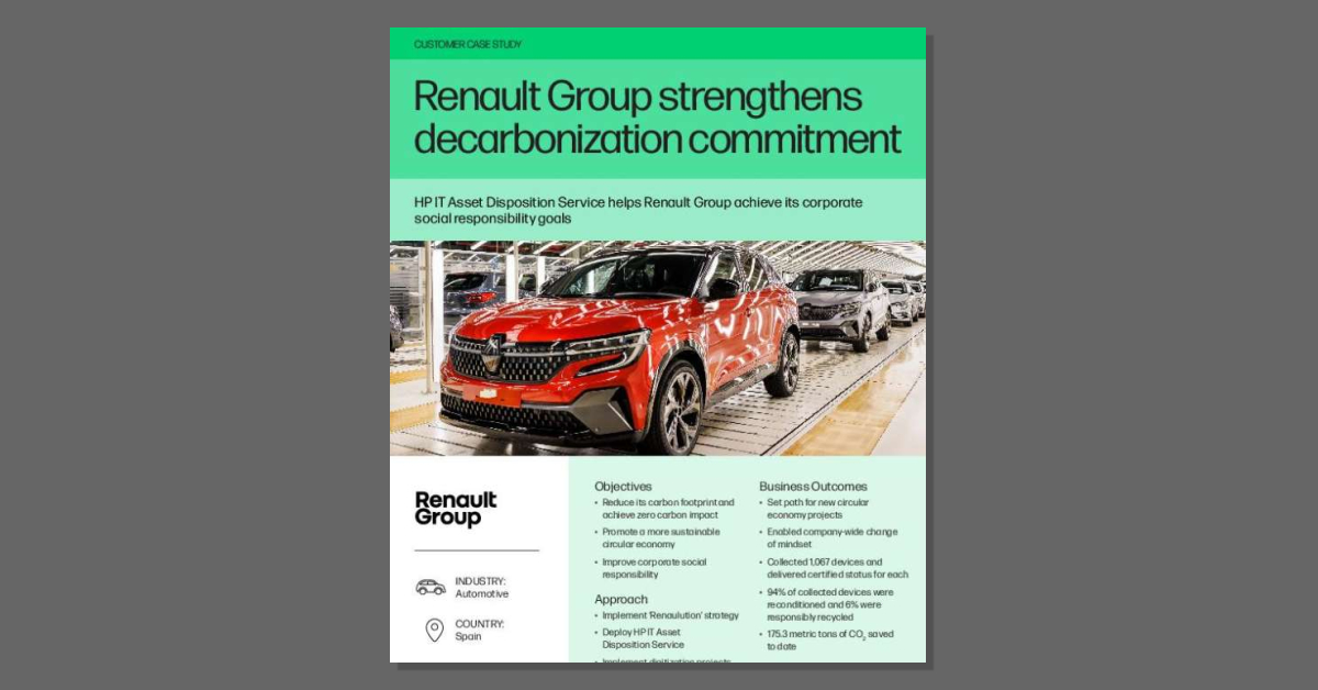 Corporate sustainability strategies demand action. This customer story shows how Renault Group used the HP IT Asset Disposition Service to meet carbon-reduction goals, reduce waste, and streamline IT operations. Read the story to discover how the program enabled the company to recondition nearly all retired devices, saving the equivalent CO₂ of more than 2,900 trees that normally takes 10 years to grow. Contact NCS Technologies, Inc. to discuss how HP Renew can help you achieve your sustainability goals.